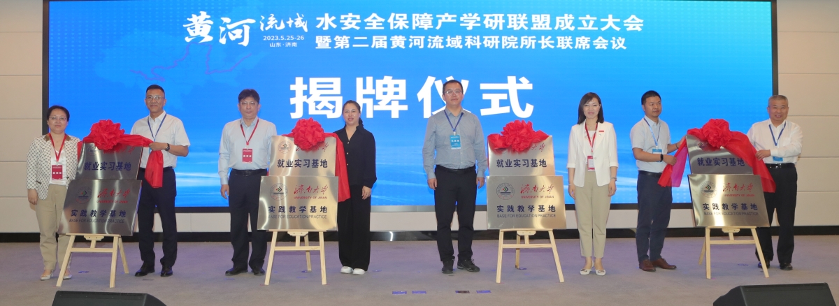 院长徐征和与山东新汇建设集团有限公司、甘肃省水利科学研究院、山东黄河勘测设计研究院有限公司、浙江河海中控信息科技有限公司四家单位代表共同为济南大学就业实习基地和实践教学基地揭牌。
