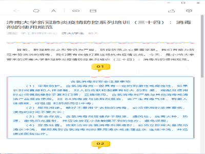 济南大学新冠肺炎疫情防控相关系列培训文章向同学们全面科普新冠肺炎防控知识,内容不仅包括新型冠状病毒肺炎的相关知识、居家防疫的基本原则、公共场合科学防护的注意事项,还有口罩正确戴取方法、正确洗手方法等具体防疫措施。此次学习充分利用微信公众号等线上平台学习相关知识,通过开展线上会议进行交流互动、分享学习进度,同时开展线上知识竞赛等方式拓展学习新模式,目的就是将宣传与教育相结合,引导广大学生正确面对疫情,帮助大家在当前抗击疫情的阻击战中能科学防护,保护好自己及他人的健康,缓解焦虑心态,理性看待疫情,保持积极良好的心态,合理规划防疫期间的学习和生活。
