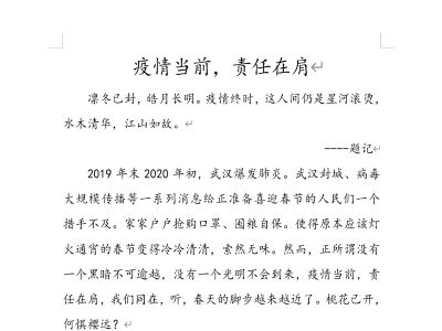 自律会发送线上通知,各班长在班级内进行宣传组织。征文可围绕主题“战疫路上,你我同行”选取一个点、一个角度、一个故事,比如呼吸的口罩、白衣天使、武汉的距离等,文体不限,可写散文抒情,或选择诗歌歌颂,旨在表达自己在这场防控新冠肺炎中的经历与感受,反映奋战在疫情防控一线的先进人物与感人事迹,传播正能量,传达真情实感,讴歌人间大爱。在近一周的作品征集期间,同学们都积极响应并踊跃参加,以高度的热情和激昂的文风展现了胸怀人民、与祖国同呼吸共命运的爱国情怀。