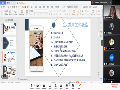 首先,由主持人致辞并宣布述职顺序,本次述职大会正式开始。之后,学生会各部部长依次进行述职汇报。各部长对2020-2021学年第一学期的学生会工作进行了总结,反思了本学期工作进行过程中的不足之处,提出相应的整改措施,并围绕第一学期个人的综合表现,包括政治态度、道德品行、学习情况、工作成效、纪律作风等方面进行述职。此外,各部长还对新学期的部门工作做出大致工作计划,力求高效率高质量地开展新学期工作。