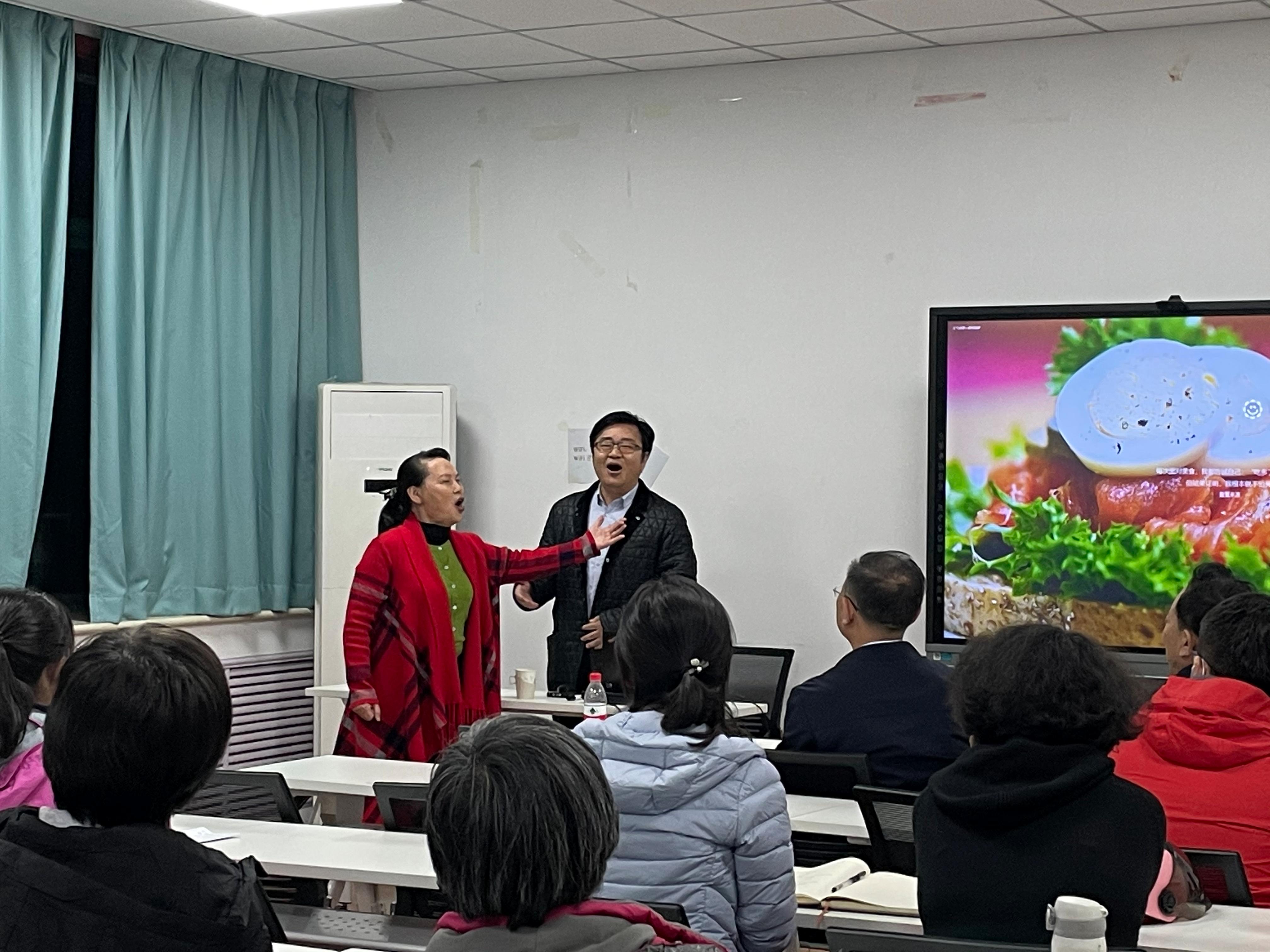 讲座开始,徐院长代表学院对李教授的到来表示热烈的欢迎。李教授采用讲解、欣赏、学习和练习相结合的方式为我们展开讲座,她指出,音乐是抽象的艺术形式,和其它的艺术形式及生活的方方面面都有相通之处,每个人对音乐的理解因为环境和心境的不同而有所不同,我们需要多发现多感受,不断提高自己的音乐欣赏和鉴赏能力,从而提升自我的人生修养。讲座最后,李教授以《同一首歌》为模板,带领大家学习歌词和歌曲的发声方式,并与师生共同演绎了歌曲。