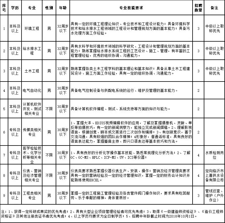 1、应聘者通过山东省公共招聘网 (//www.ggzp.sdhrss.gov.cn/)、市国资委网站(//www.lysgzw.gov.cn/index.php)、市水务集团网站(//www.lysswjt.com/ )下载《临沂市水务集团2018年公开招聘专业技术人员报名人员简历表》及《临沂市水务集团2018年公开招聘专业技术人员报名资格审查登记表》(以下简称《登记表》),填写并发送至指定邮箱。报名时间:2018年10月9日至2018年10月21日。
