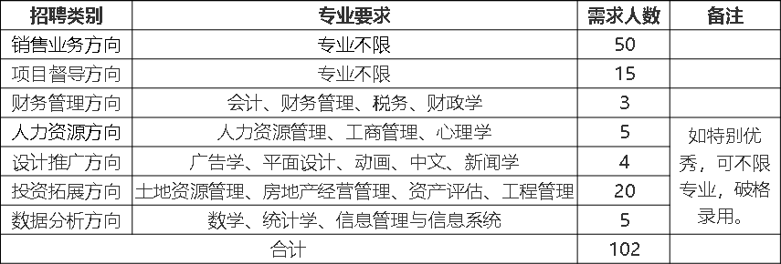 (四)薪资待遇 1、试用期薪资标准:本科生:5000元/月;硕士:6000元/月;海归本科:6000元/月; 2、销售高额佣金+五险一金+食宿+津贴补助; 3、带薪事假、病假、年假等; 4、通讯费补贴、出差补贴、学习福利、节日福利、生日福利、防暑降温费等。 (五)转正发展 根据公司发展战略,结合个人意愿,分配至全国项目。转正定岗在销售一线管理岗位以及职能管理岗位,薪资参照新岗位执行。 四、应聘方式 发送简历至集团邮箱:[email protected]命名格式为:姓名+学校+管培生; |
