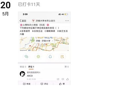 本次活动通过微博“济南大学水环心动力”和微信小圈子打卡展开,由自律会心健部工作人员每天挑选心理知识及心理问题发布在微博“济南大学水环心动力”中,参与人员需在活动期间关注微博“济南大学水环心动力”,坚持每天认真学习微博发布的心理知识,根据自己对问题的理解和心理知识的掌握情况在评论区进行做答,并将自己答题的截图发布在微信小圈子“‘心理知识小课堂’打卡圈”进行打卡。新颖的线上活动形式大大激发了同学们的积极性,同学们踊跃参加答题,董庆春、董怡彤、李倩、倪圆圆、吴向楠、尚凯月等十一位同学坚持每天答题打卡达十天及以上,其中董庆春同学的正确率最高。