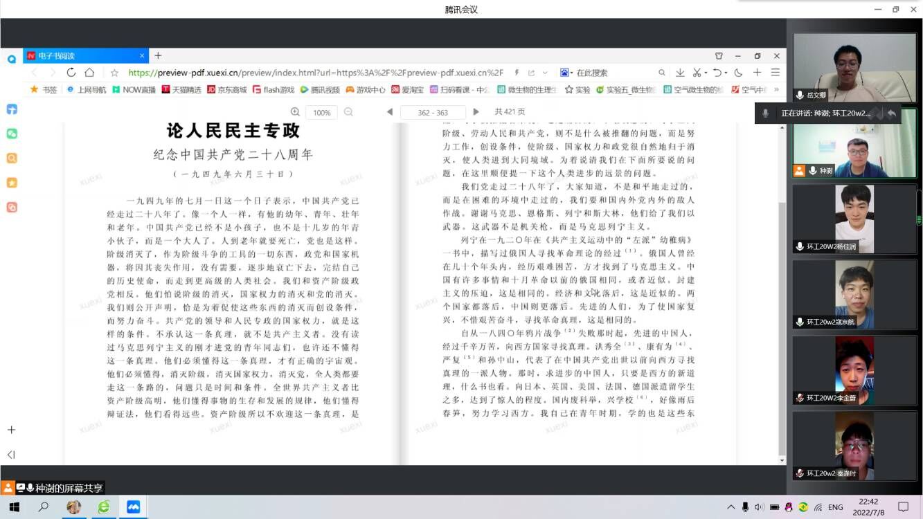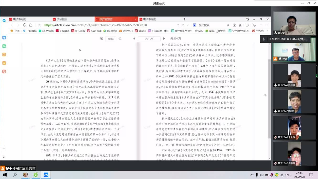“青年党史研学社”暑期社会实践团队由指导老师白健和种澍、岳文卿、秦逢时、寇京航、李金蔚、臧少凡、李冰语、杨佳润、张心悦九名成员组成。此次实践活动旨在提高当代青年的科学文化素质,深刻学习党艰苦卓绝的发展历史。本次实践活动主要采取线上腾讯会议的方式进行,团队成员通过观看相关视频学习探讨党的发展历程,同时研究学习习近平谈治国理政、毛泽东选集、列宁选集、马克思恩格斯合集、共产党宣言、“九二共识”会谈记录等电竞盘口-电竞博彩平台相关的文章和书籍,通过生动的文字更加深刻体会中国共产党党曲折而漫长探索之路。