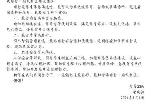 自律会发起,面向全院学生征集宿舍社区建设的创意和建议。同学们积极响应,纷纷提交了自己的建议书。这些建议涵盖了宿舍设施改善、环境美化、安全管理、文化建设等多个方面,充分展示了同学们对宿舍社区建设的热情和创意。