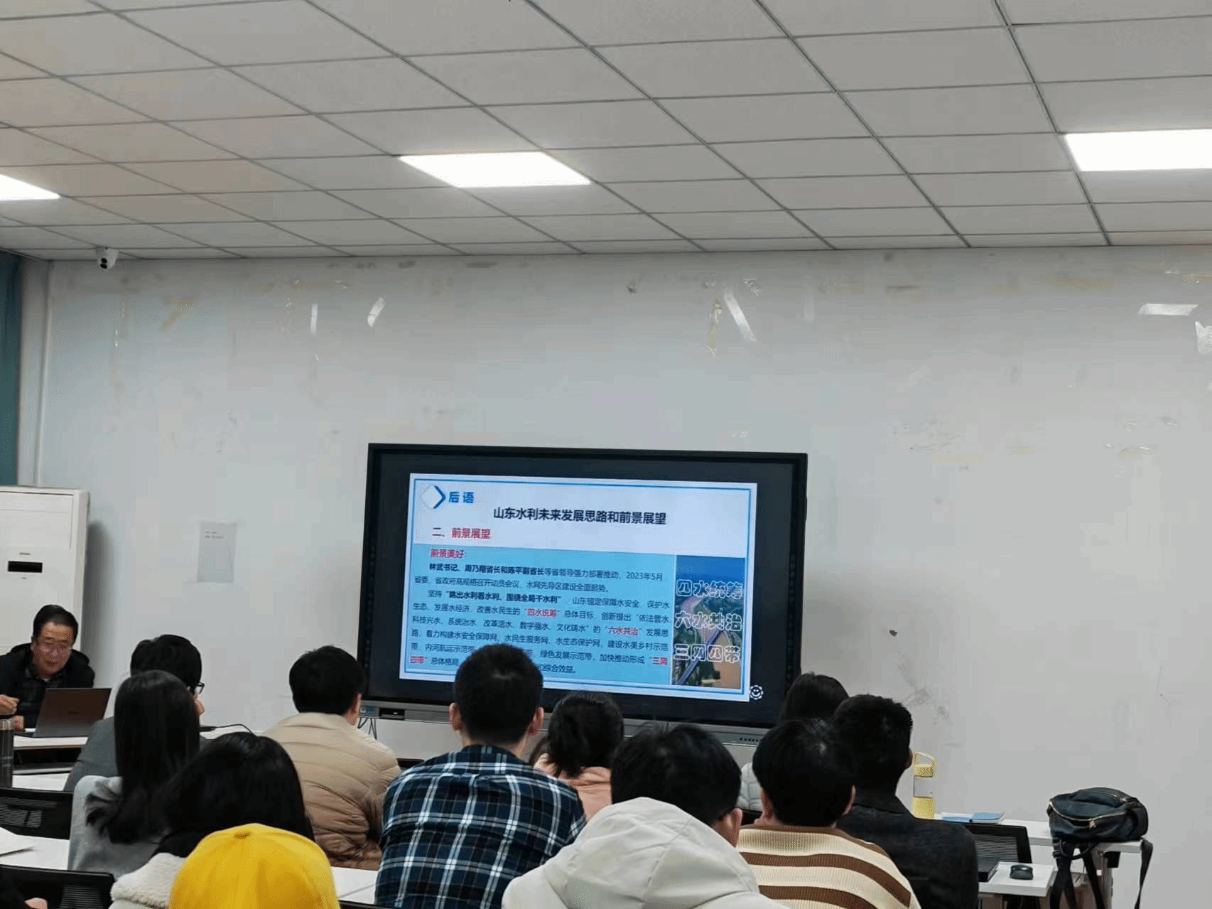 刘院长以《水利规划与现代水网》为题,围绕“水利规划定位、内容和体系要求”、“国家现代水网的规划背景、总体框架”、“山东省级水网的重大课题”和“水利未来发展规划”四个方面展开报告。刘院长首先阐述了规划对于流域高质量发展的重要意义,强调“规划科学是最大效益,规划失误是最大浪费,规划折腾是最大忌讳”;其次,从国家层面分析了国家骨干水网规划顶层设计,阐述了对“系统完备、安全可靠、集约高效、绿色智能、循环畅通、调控有序”24字现代水网建设目标的理解;第三,从山东省级层面分析了我省在落实国家水网规划方面,实施的一系列的科学、精细规划,提出了现代水网需开展的重大研究课题。最后,针对我省 “十四五”水利发展规划,指出坚定落实省政府和水利厅制定的“四水统筹、六水共治、三网四带”发展目标,水利发展前景美好。