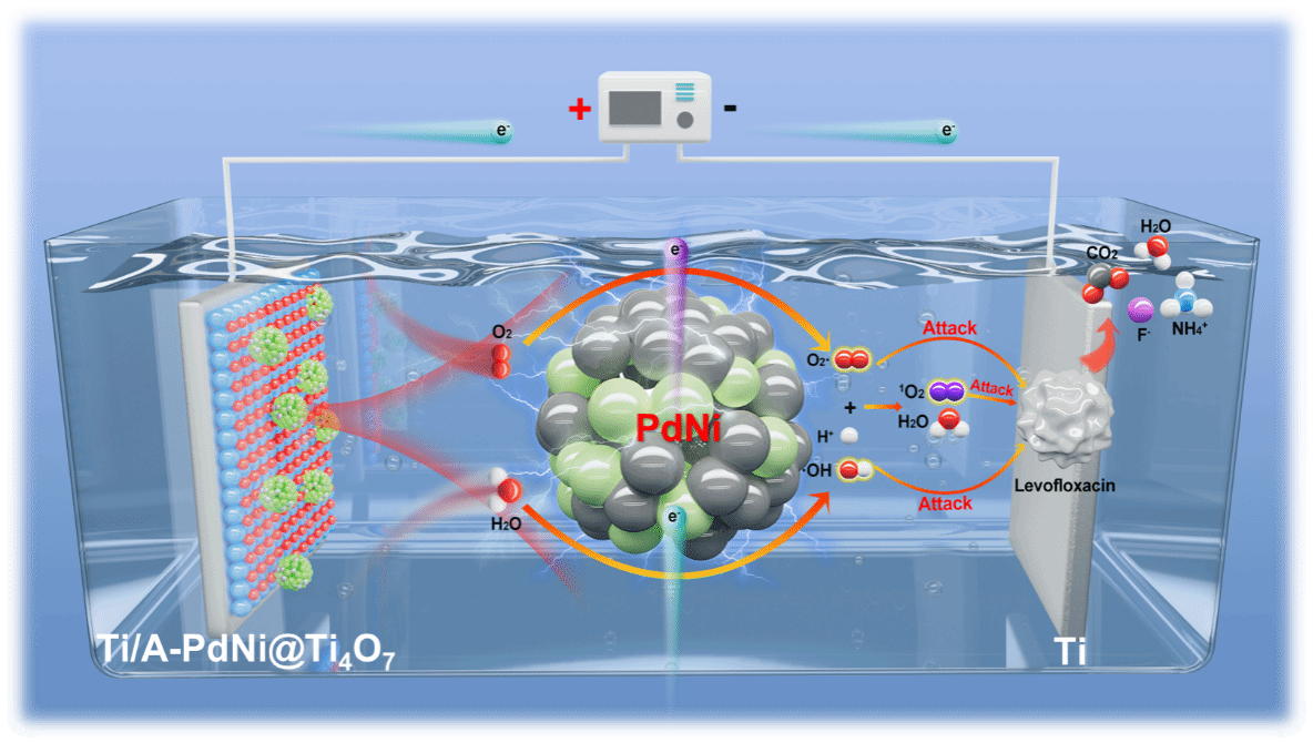 针对这一难题,研究团队设计并制备了一种新型非晶态PdNi合金修饰的亚氧化钛电极(A-PdNi@Ti4O7)材料。该电极通过调控电子金属-载体相互作用(EMSI),显著提升了界面电子转移能力,并实现了羟基自由基(·OH)、超氧自由基(·O2-)和单线态氧(1O2)的协同生成,从而高效降解典型抗生素——左氧氟沙星(LEV)。