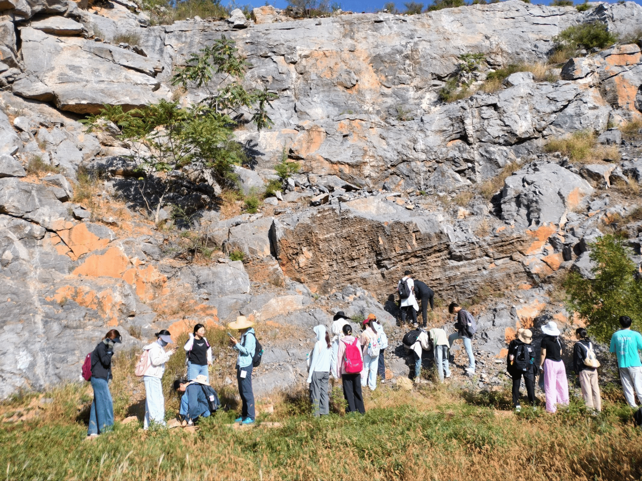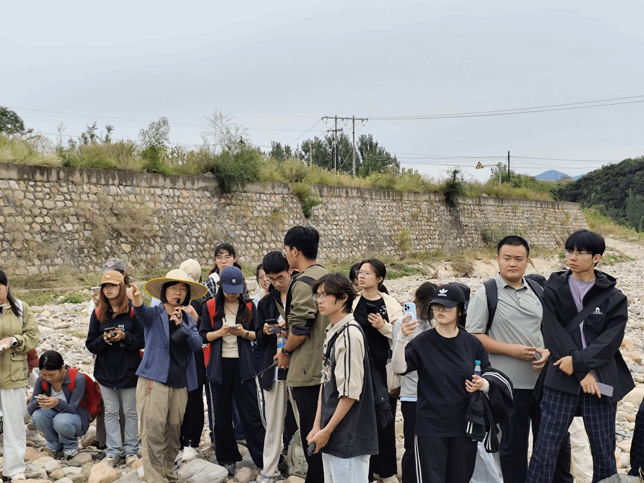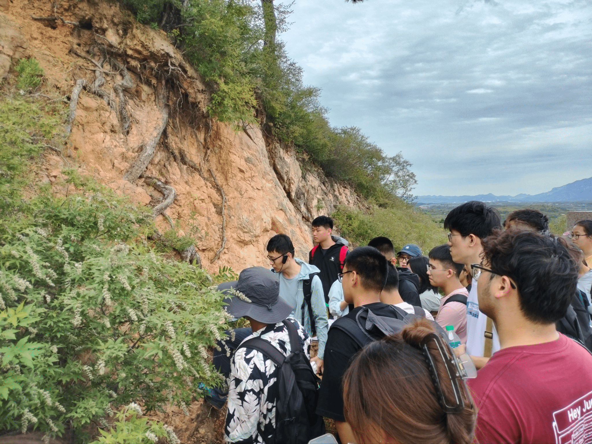 在为期一周的柳江盆地野外实践中,师生综合运用岩层剖面观测、构造地貌分析、水文测量与植被调查等方法,系统解析了区域地质演化过程。通过对鸡冠山、东部落-潮水峪、亮甲山、花厂峪-傍水崖等典型地质剖面的实地观测与测量,学生们直观还原了华北板块的海陆变迁历史,重建了柳江盆地的形成与演化过程;沿大石河从高山深谷至渤海之滨的河流断面监测、泉水观测与河海地貌解析,深入理解河流与海洋对盆地生态环境的塑造机制,以及人类活动对自然演变的影响。同学们在野外实践中检验了课堂所学的构造地质、地貌演化、生态水文等理论知识,强化了地理学综合思维与实践能力的融合。