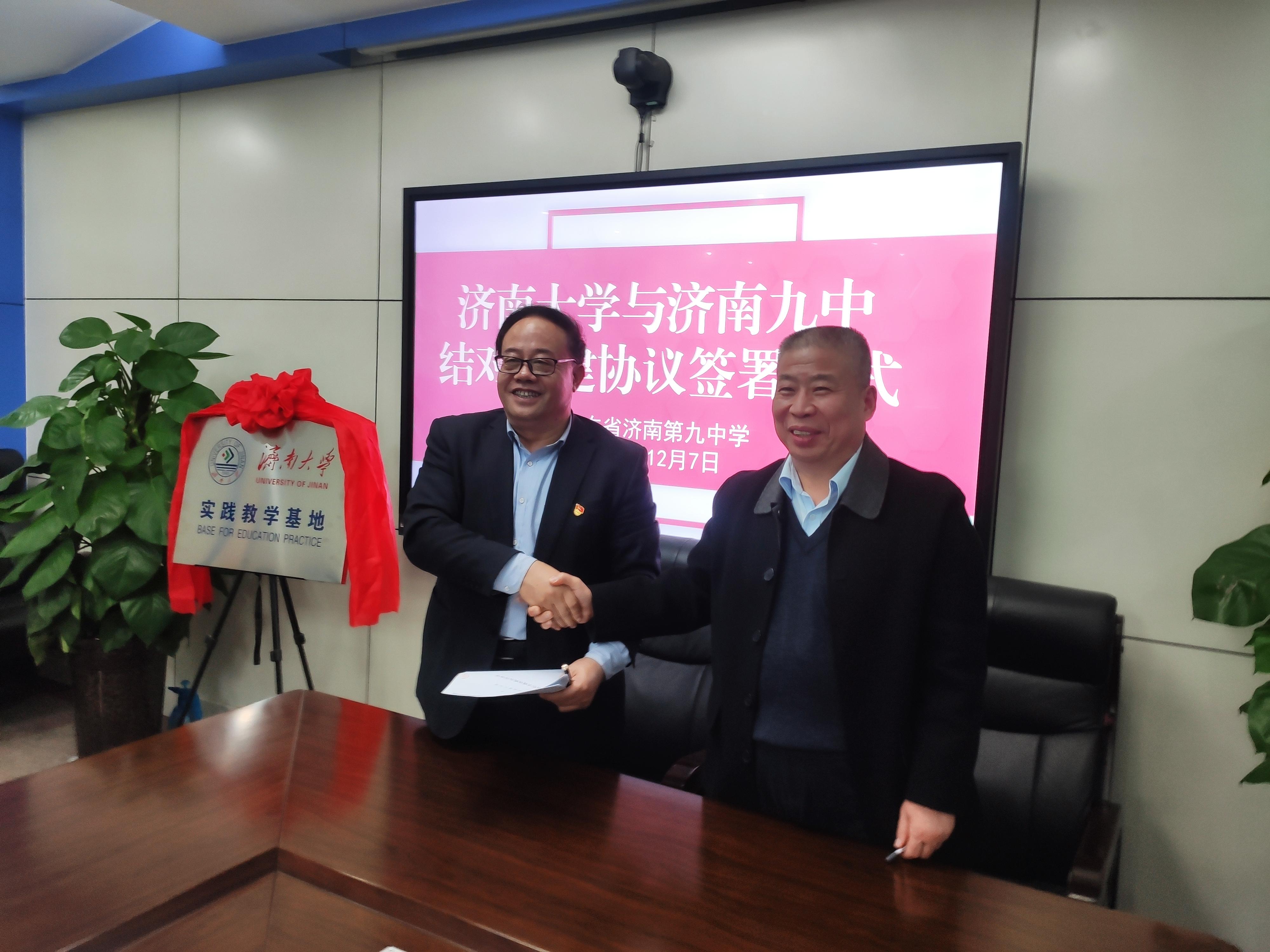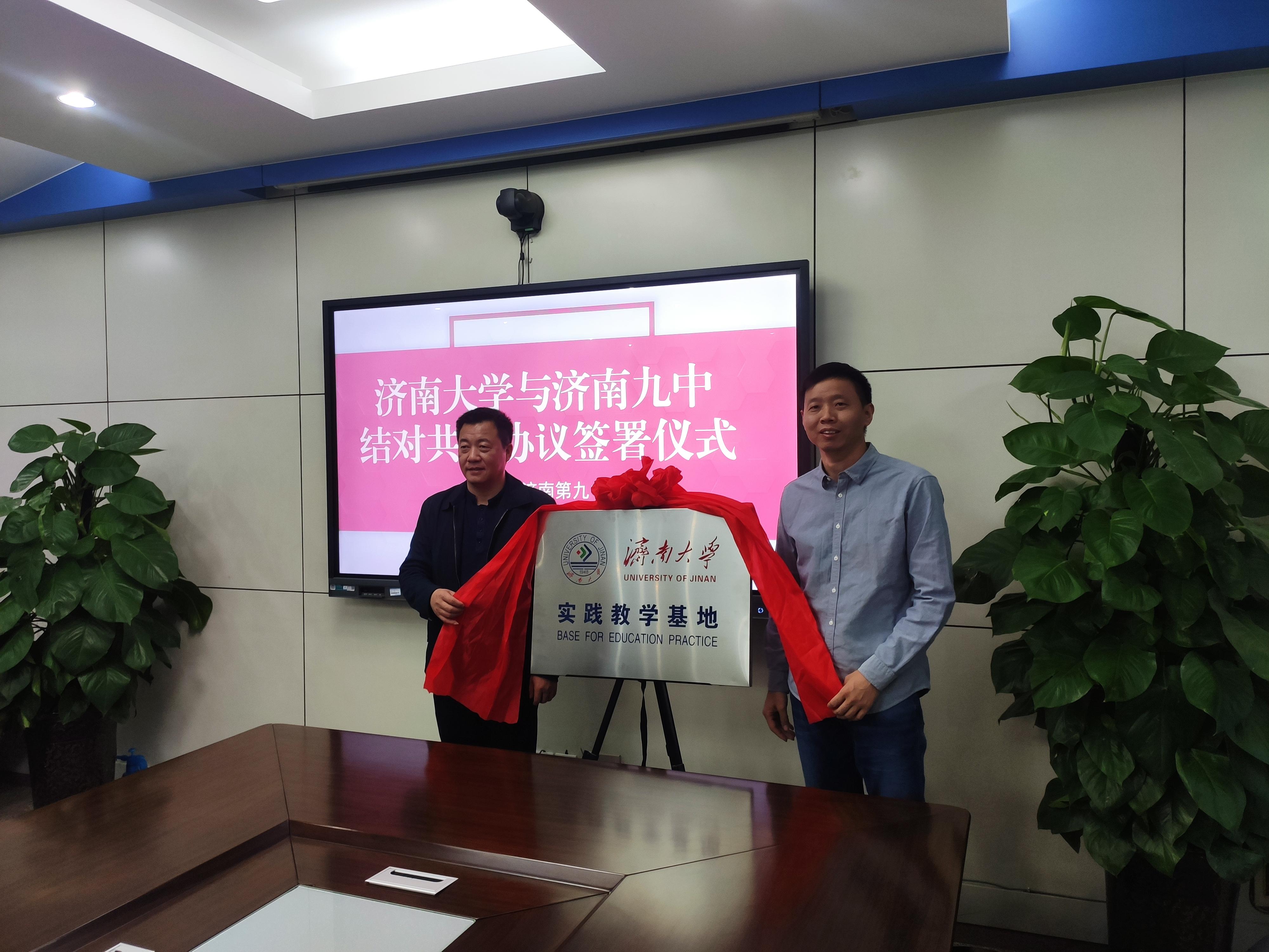 会上,苗翠强校长与徐征和院长共同签署《济南大学—山东省济南第九中学合作共建战略合作协议》和《济南大学本科实践教学基地建设协议》。韩东副校长和庞桂斌副院长共同为济南大学本科实践教学基地揭牌。双方商定,依托山东省济南第九中学的组织、平台和教育教学资源,以及电竞博彩平台